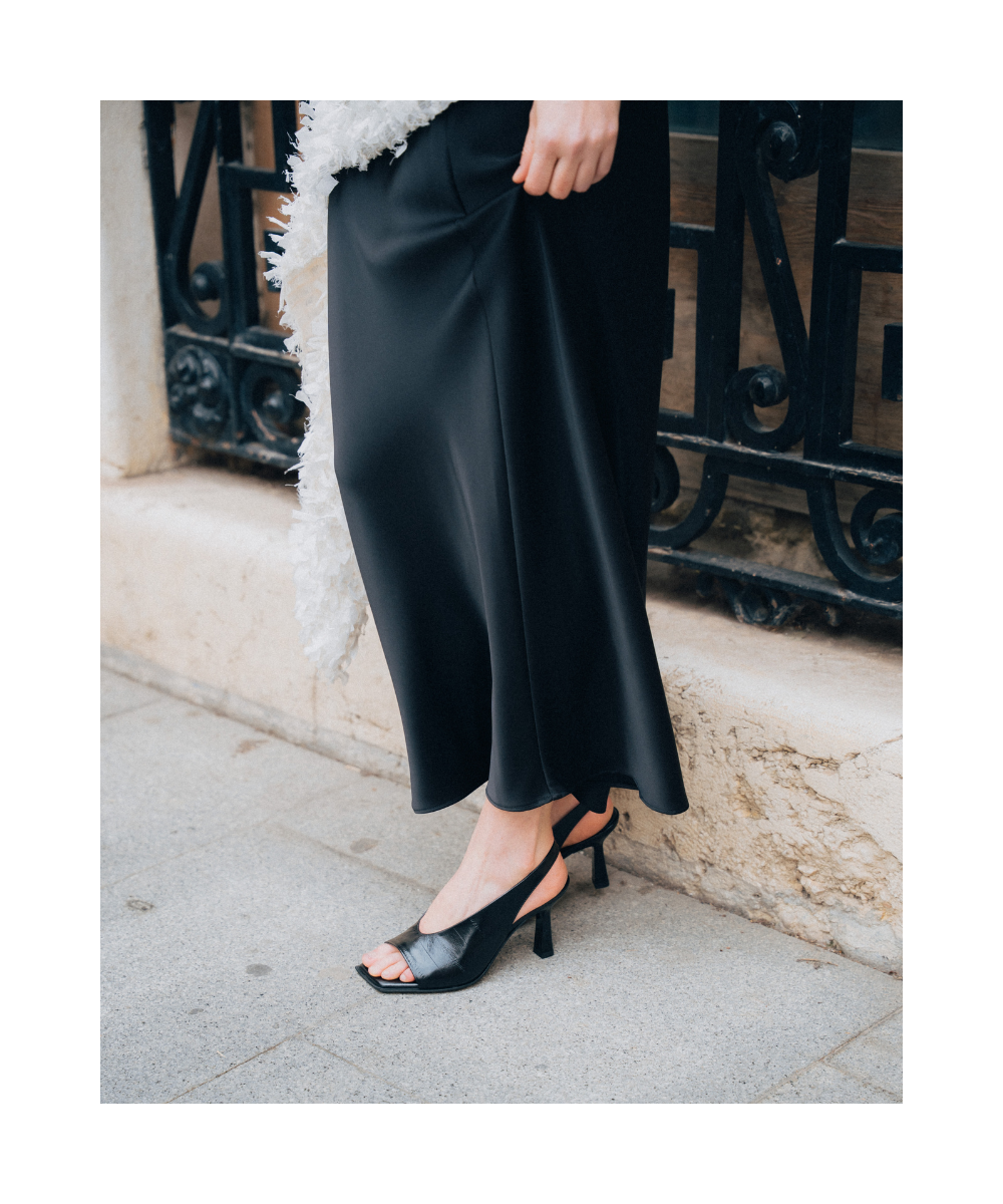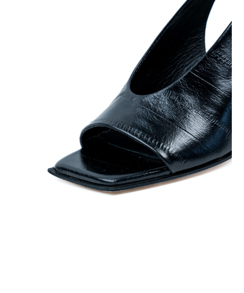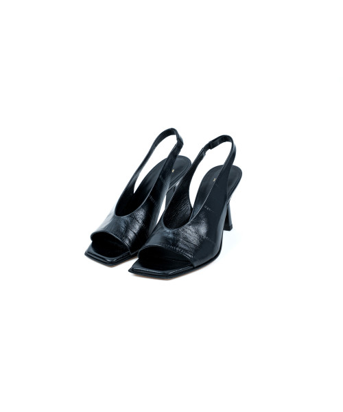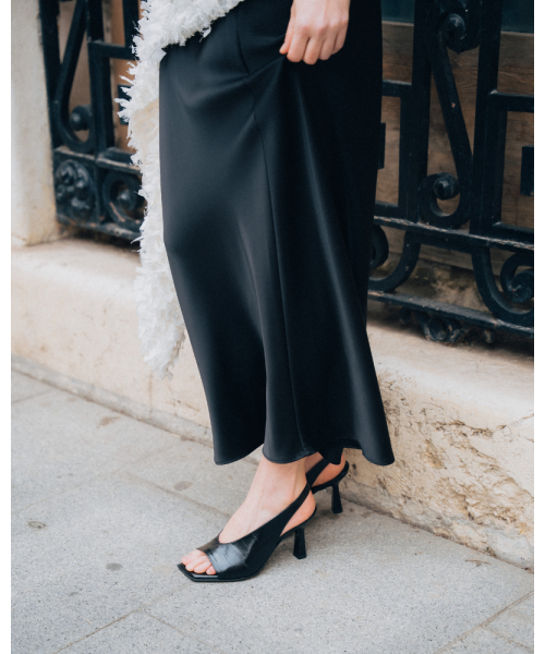 Black leather sandals. Designed with an elegant, contemporary twist, these sandals are characterised by their shape and slim heel, which combine style and comfort. They are fastened with a thin leather strap featuring an elasticated fastening at the heel.