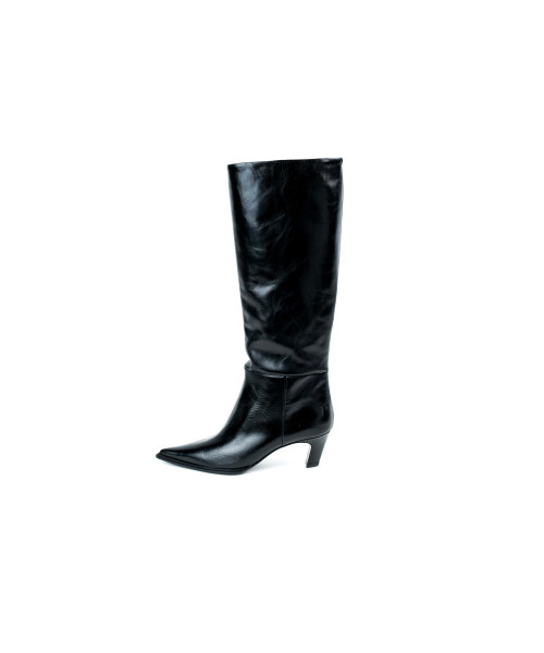 Boot made of black leather. Designed with an elegant pointed toe, it is characterised by its elegance and simplicity. This model is easily adjustable so you can wear it comfortably with its 6 cm high heel.
