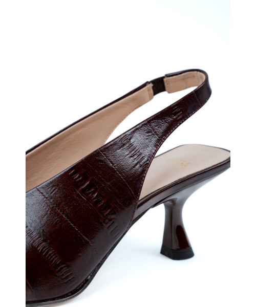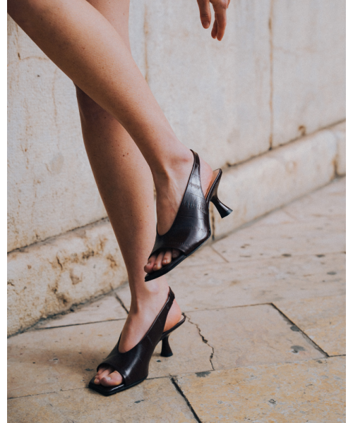 Chocolate-coloured leather sandals. Designed with an elegant, contemporary twist, these sandals are characterised by their shape and slim heel, which combine style and comfort. Furthermore, they are fastened with a thin leather strap featuring an elasticated fastening at the heel.