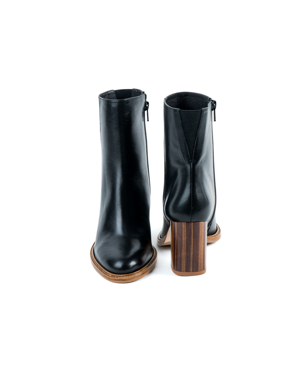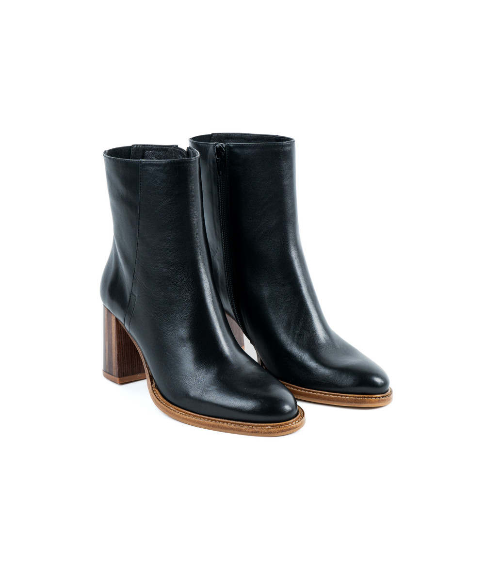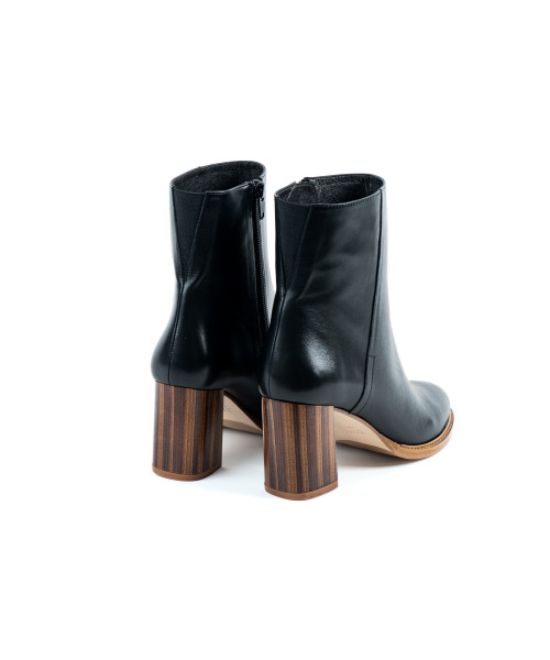 Black leather ankle boots. Designed with an elegant round toe, they are characterised by their elegance and simplicity. This model is easy to put on thanks to a zip on the inside of the side, allowing you to wear them comfortably with their 7 cm high heel.