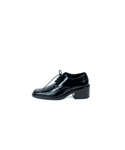 Black leather loafer. Designed with an elegant semi-rounded toe, it is characterised by its classic, elegant and timeless shape. This model is easily adjusted with a lace-up fastening so you can wear them comfortably with their 5 cm mid-heel.