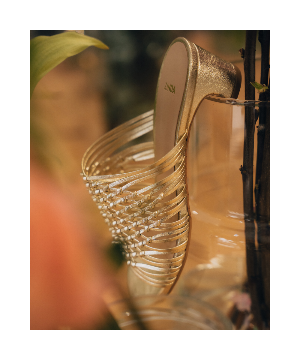 Gold-coloured open-back sandals made from raffia. Featuring a pointed toe, this unique design—hand-crocheted by local artisans—allows the feet to breathe. Furthermore, these sandals have a small heel that combines elegance with comfort.