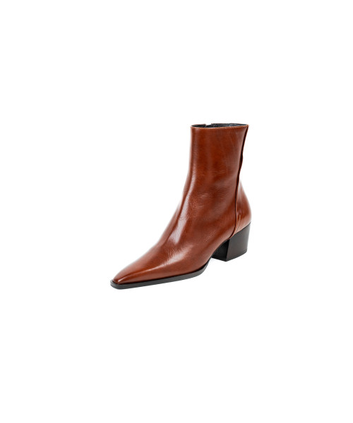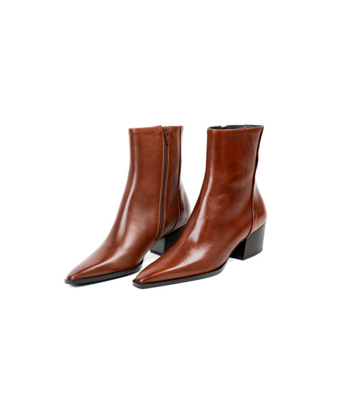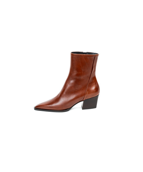 Ankle boots made from brandy-coloured leather. Designed with an elegant pointed toe, they are characterised by their elegance and simplicity. This model is easy to adjust with a zip on the inner side, allowing you to wear them comfortably with a 5 cm mid-heel.