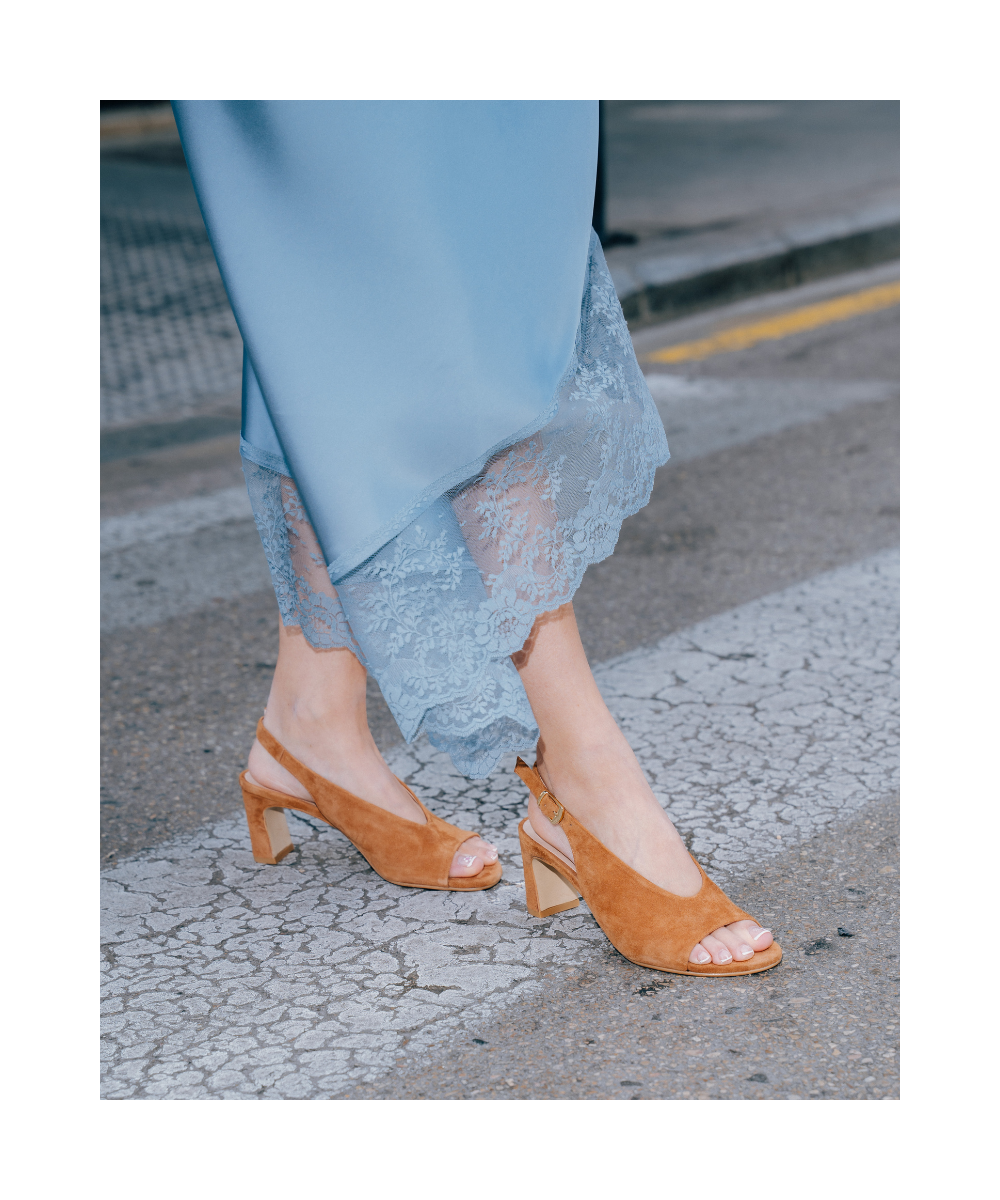 A tan-coloured sandal made from suede. Designed with an elegant, contemporary touch, this sandal is characterised by its shape and its slim heel, which offers both style and comfort. Furthermore, the shoe is fastened with a thin leather strap featuring an elasticated fastening at the heel.