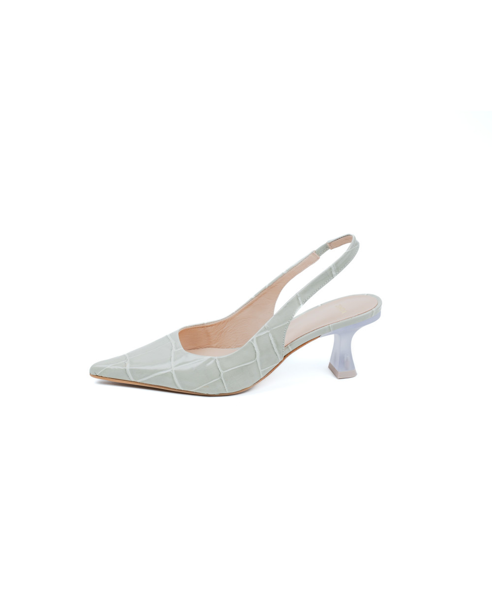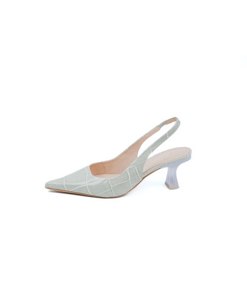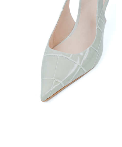 A pearl-coloured open-back shoe crafted from soft leather. Featuring an elegant pointed toe, it stands out for its unique texture. This style has an adjustable elasticated back strap, making it easy to slip on and wear comfortably, complemented by its mid-height heel.