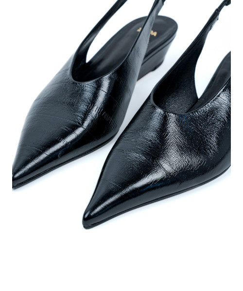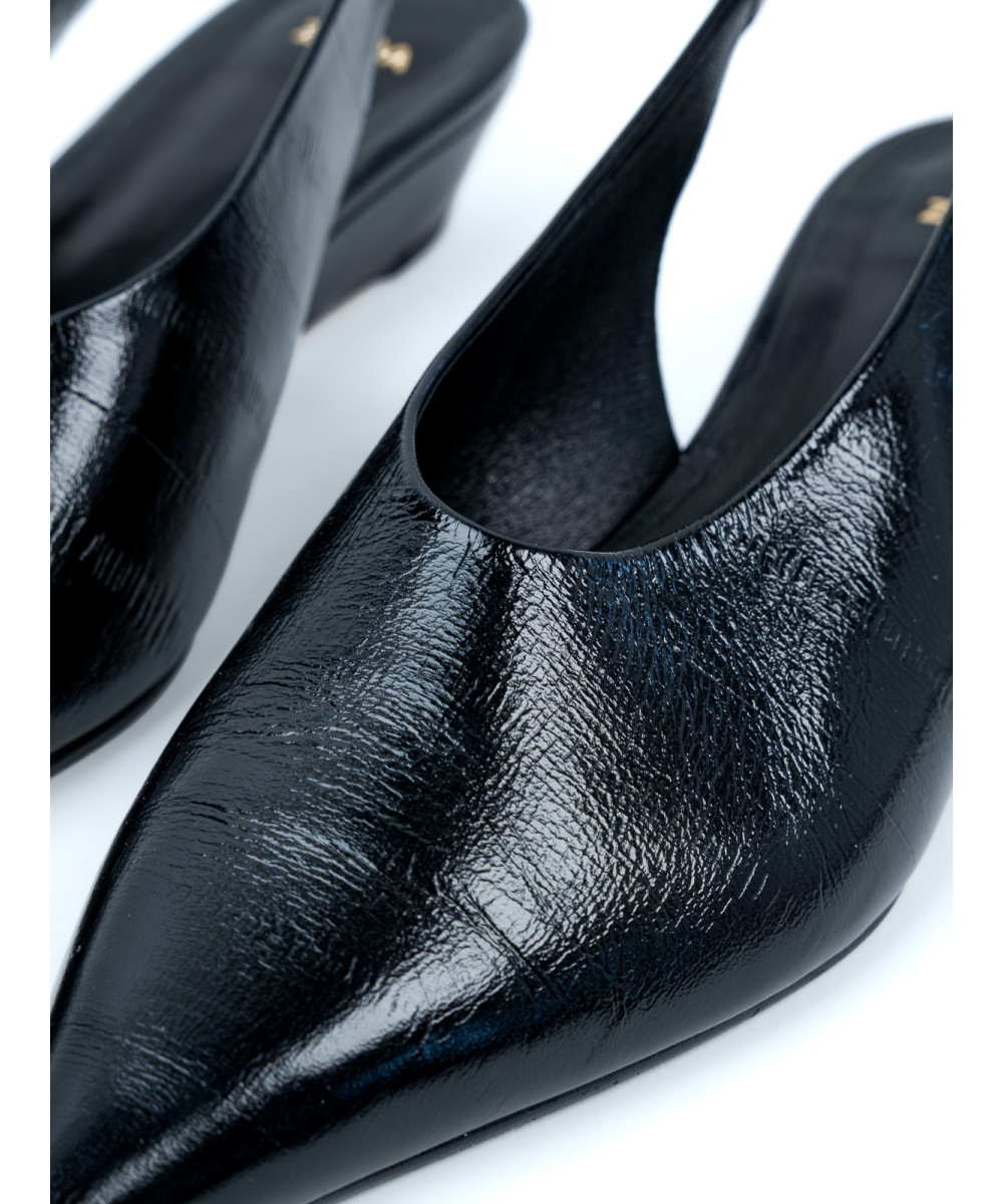 Zapatos de salón negros de piel con talón descubierto. Con una elegante puntera, estos zapatos se caracterizan por un pequeño tacón de cuña que les aporta un toque moderno y sofisticado. Además, se abrochan con una fina tira de piel con cierre elástico en el talón, garantizando comodidad en cada paso.