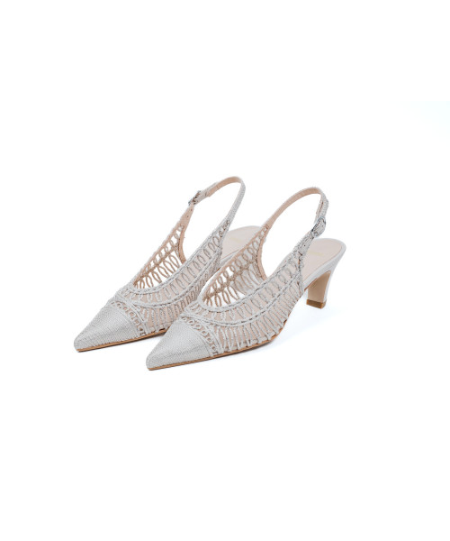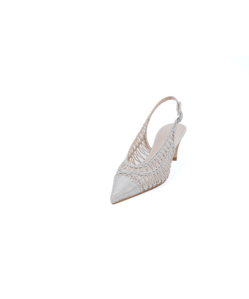 A nougat-coloured open-back sandal made from raffia. Featuring a pointed toe and a medium heel, this original design—hand-crocheted by local artisans—allows the foot to breathe. It fastens at the back with a thin strap fitted with an adjustable buckle.