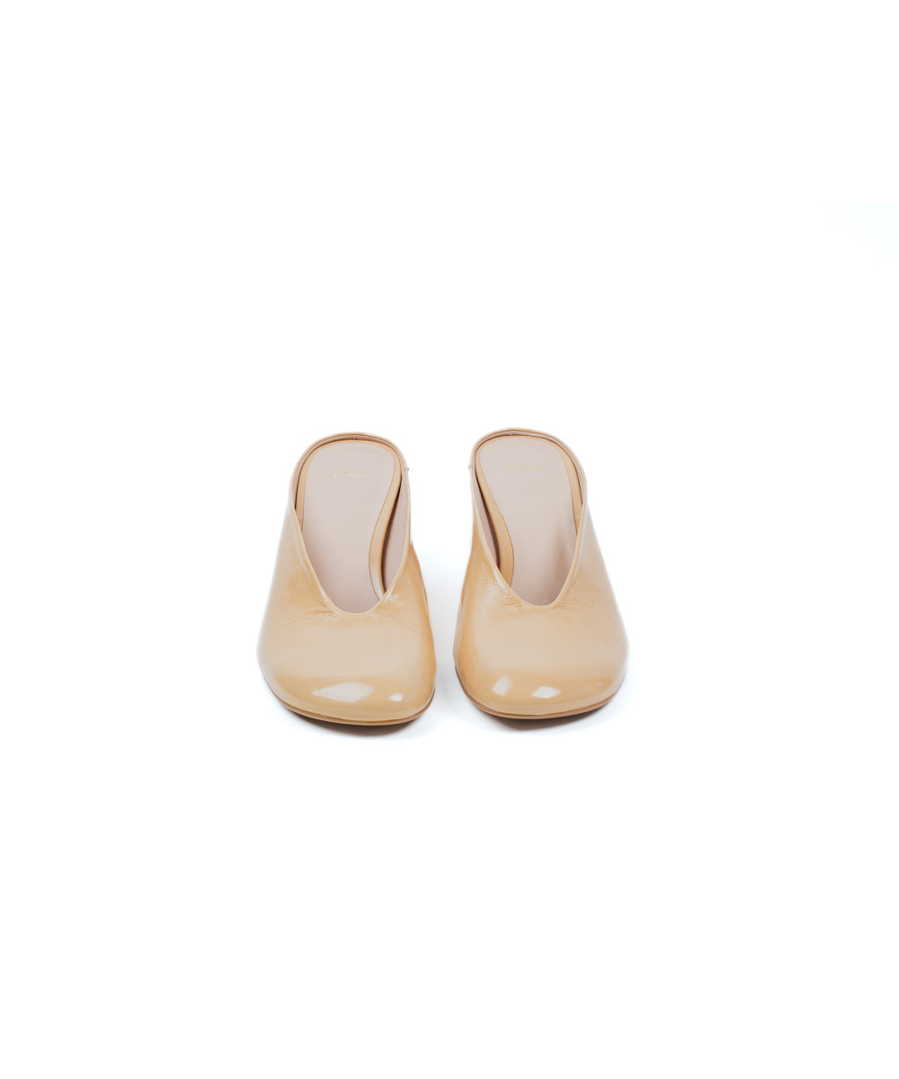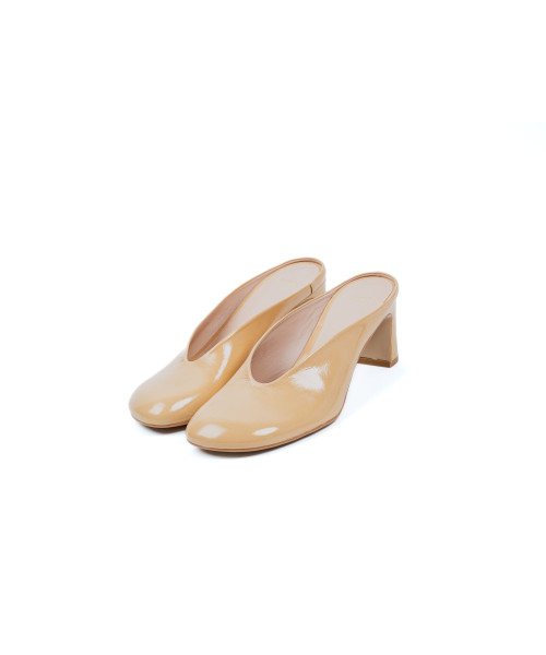 A nougat-coloured mule made from leather. Featuring an elegant rounded toe, it is characterised by its classic, open-back design. This style slips on easily without fastenings, making it comfortable to wear with its mid-height heel.