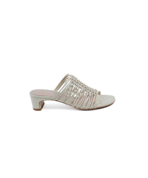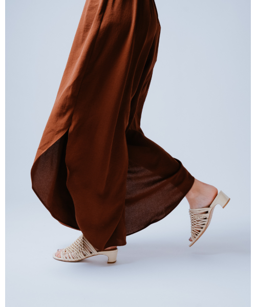Talco-coloured open-back sandals made from raffia. Featuring a pointed toe, this unique design—hand-crocheted by local artisans—allows the feet to breathe. Furthermore, these sandals have a small heel that combines elegance with comfort.