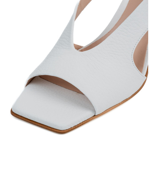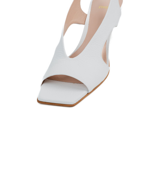 White open-back shoes made from soft leather. Featuring an elegant square toe, they are characterised by their distinctive design with symmetrical cut-outs. This style has an adjustable elasticated back strap, making them easy to slip on and comfortable to wear, complemented by a medium heel.