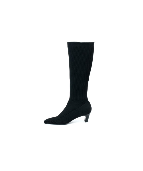 Bota fabricada en textil de color negro. Diseñado en una elegante punta fina, se caracteriza por su comodidad y flexibilidad. Este modelo se ajusta fácilmente para poder vestirlos y llevarlos cómodamente junto con el tacón medio de 5 cm.