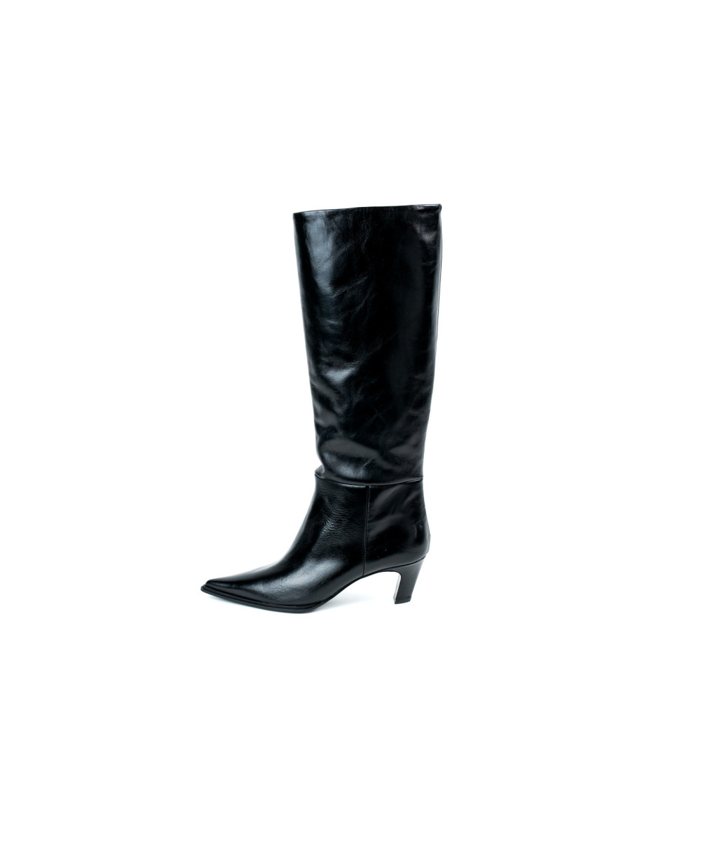 Bota fabricada en piel de color negro. Diseñada en una elegante punta fina, se caracteriza por su elegancia y sencillez. Este modelo se ajusta fácilmente para poder vestirlos y llevarlos cómodamente junto con el tacón alto de 6 cm.