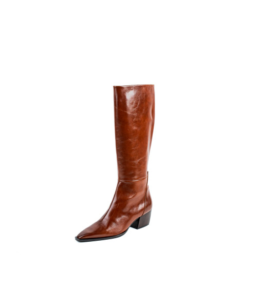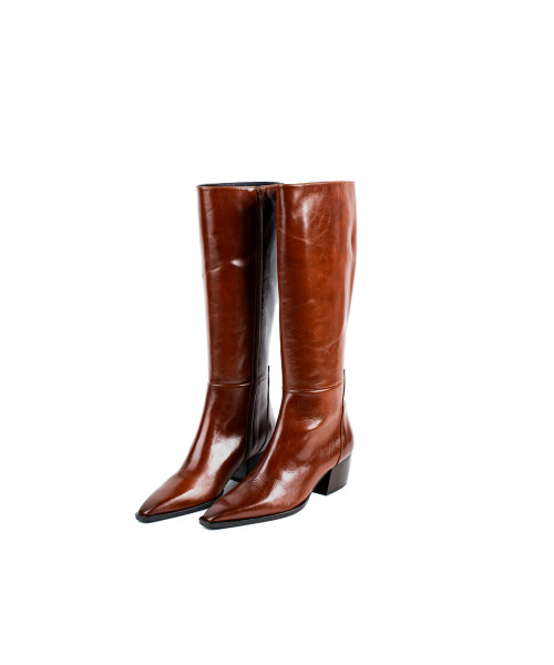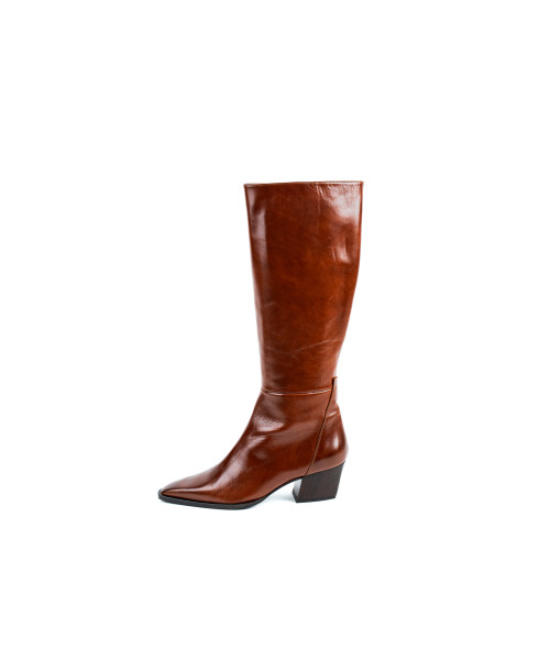 Bota fabricada en piel de color brandy. Diseñada en una elegante punta fina, se caracteriza por su sencillez y elegancia. Este modelo se ajusta fácilmente con una cremallera en la parte lateral interna para poder vestirlos y llevarlos cómodamente junto con el tacón medio de 5 cm.