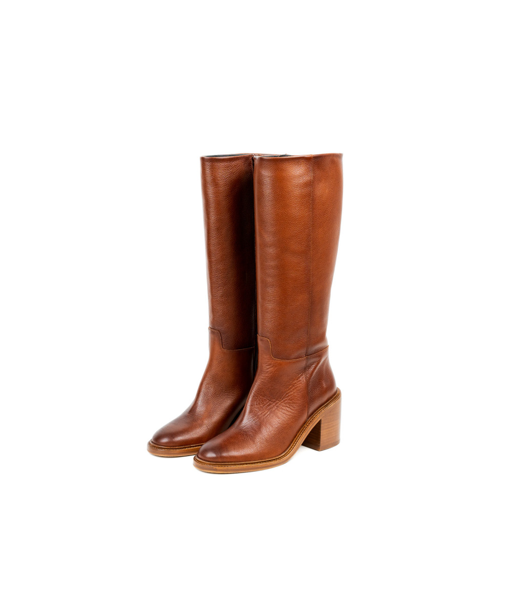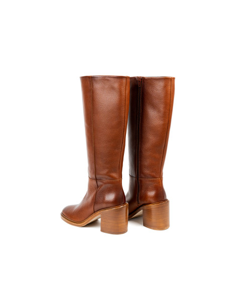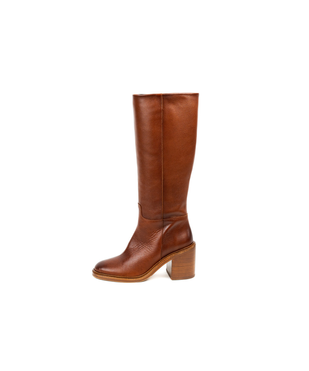 Bota fabricada en piel de color marrón. Diseñada en una elegante punta redonda, se caracteriza por su elegancia y sencillez. Este modelo se ajusta fácilmente con una cremallera en la parte lateral interna para poder vestirlas y llevarlos cómodamente junto con el tacón alto de 8 cm.