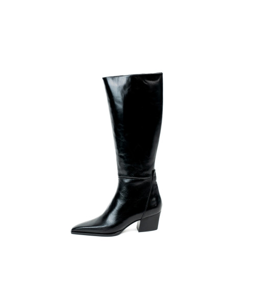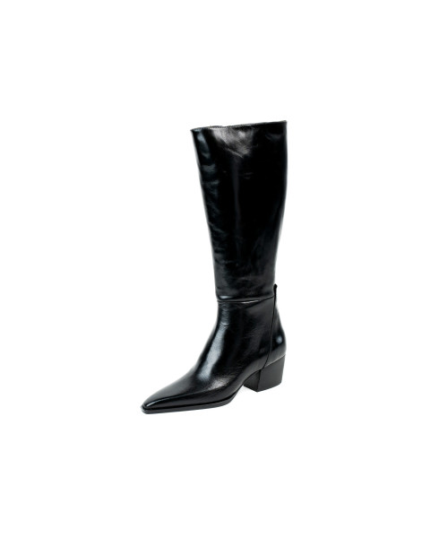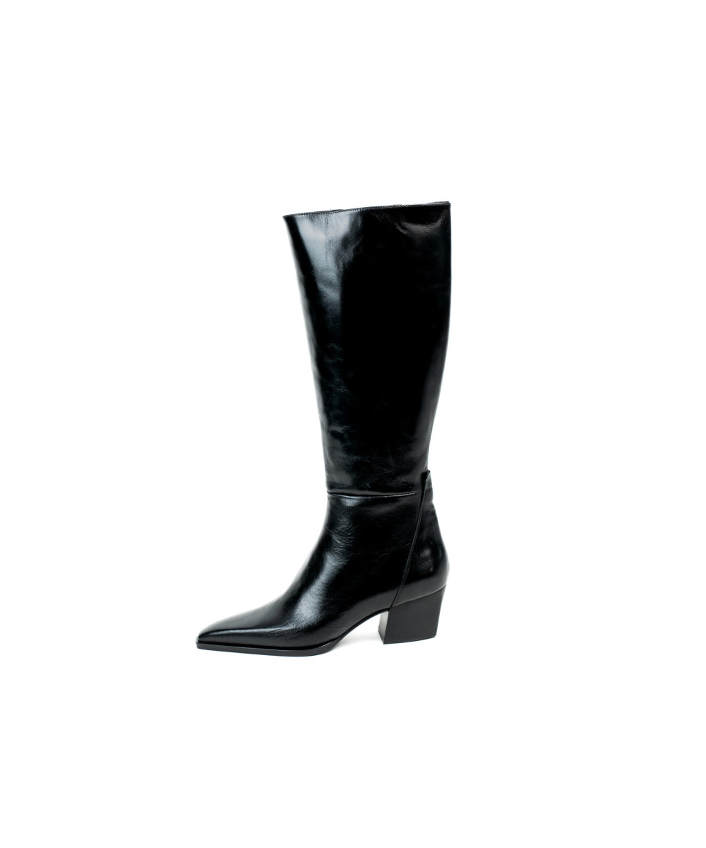 Bota fabricada en piel de color negro. Diseñada en una elegante punta fina, se caracteriza por su sencillez y elegancia. Este modelo se ajusta fácilmente con una cremallera en la parte lateral interna para poder vestirlos y llevarlos cómodamente junto con el tacón medio de 5 cm.