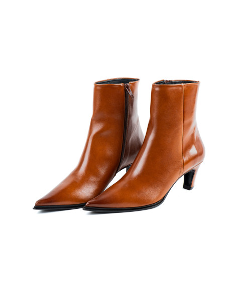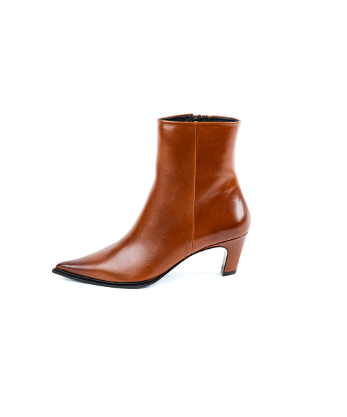 Botín fabricado en piel de color cuero. Diseñado en una elegante punta fina, se caracteriza por su sencillez y elegancia. Este modelo se ajusta fácilmente con una cremallera en la parte lateral interna para poder vestirlos y llevarlos cómodamente junto con el tacón medio de 6 cm.