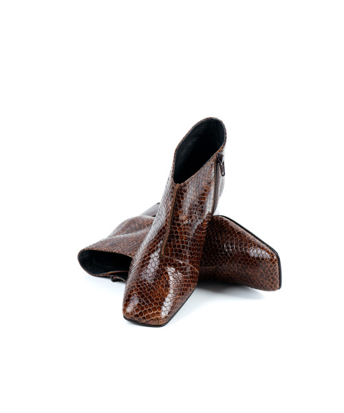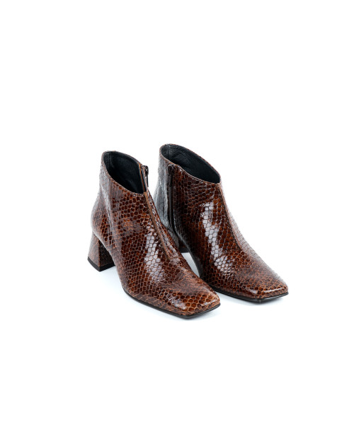 Botín fabricado en piel grabada en piel de color cuero. Diseñado en una elegante punta cuadrada, se caracteriza por su forma clásica, elegante y atemporal. Este modelo se ajusta fácilmente con una cremallera en la parte lateral interna para poder vestirlos y llevarlos cómodamente junto con el tacón de 5,5 cm.