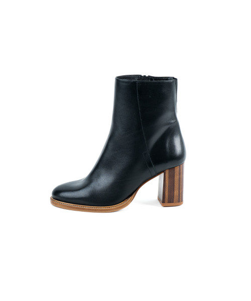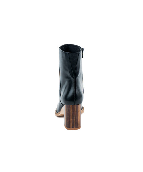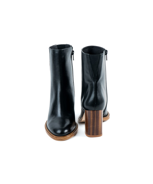 Botín fabricado en piel de color negro. Diseñado en una elegante punta redonda, se caracteriza por su elegancia y sencillez. Este modelo se ajusta fácilmente con una cremallera en la parte lateral interna para poder vestirlos y llevarlos cómodamente junto con el tacón alto de 7 cm.