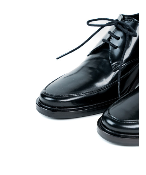 Mocasín fabricado en piel de color negro. Diseñado en una elegante punta semi redonda, se caracteriza por su forma clásica, elegante y atemporal. Este modelo se ajusta fácilmente mediante un cierre con cordones para poder vestirlos y llevarlos cómodamente junto con el tacón medio de 5 cm.