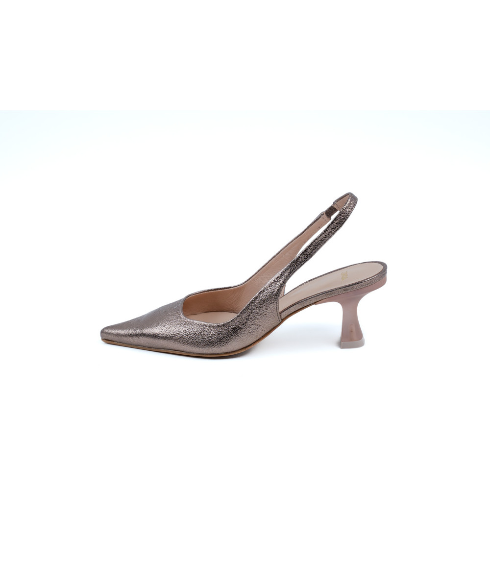 Salón destalonado de color piedra fabricado en piel suave. Diseñado en una elegante punta fina, se caracteriza por su original textura. Este modelo tiene una tira elástica trasera ajustable para poder vestirlos y llevarlos cómodamente junto a su tacón medio.