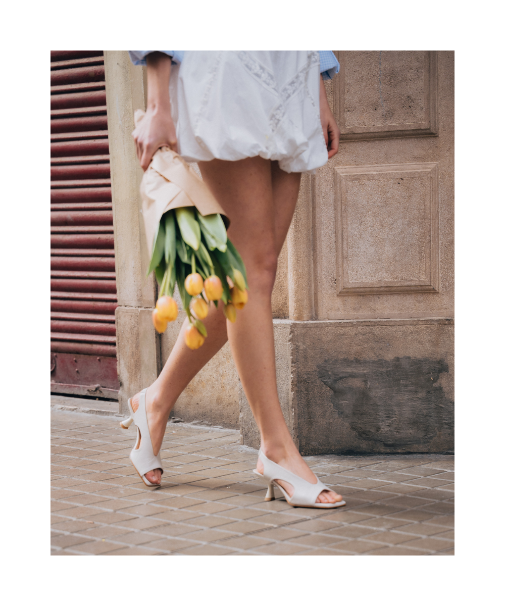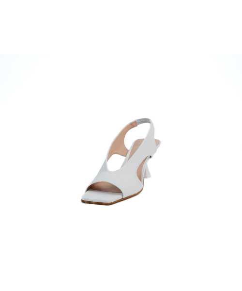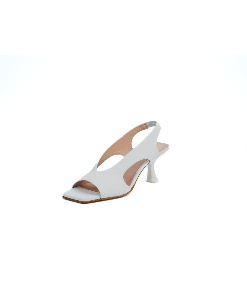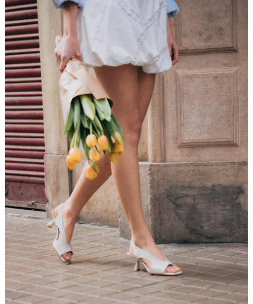 Salón destalonado de color blanco fabricado en piel suave. Diseñado en una elegante punta cuadrada, se caracteriza por su original diseño con aperturas simétricas. Este modelo tiene una tira elástica trasera ajustable para poder vestirlos y llevarlos cómodamente junto a su tacón medio.