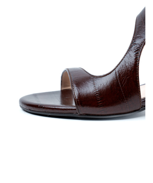 Sandalia en color chocolate fabricada en piel. Diseñada con una elegante punta redonda, esta sandalia se caracteriza por sus tiras asimétricas situadas en la parte delantera, que pemiten la correcta sujeción del pie. Adicionalmente, esta sandalia tiene un pequeño tacón que combina elegancia y comodidad.