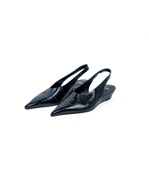 Salón destalonado en color negro fabricado en piel. Diseñado con una punta elegante, este salón se caracteriza por tener una pequeña cuña, aportando un toque de modernidad y elegancia. Además, este zapato se sujeta con una fina tira de piel con cierre elástico en el talón aportando comodidad en cada pisada.